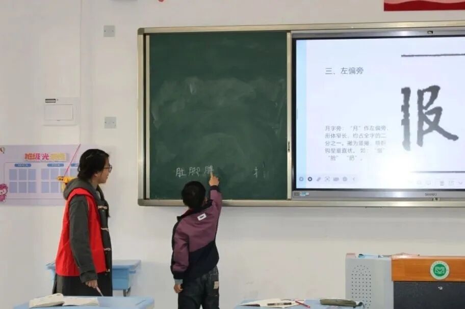深耕硬笔书法教学,打造“文化溯源—技法精研—实践运用”的教学闭环。志愿者以汉字演变故事为引,用趣味动画拆解字形结构,手把手指导执笔姿势与笔画规范,引导孩子们在田字格里描摹练习、在组词造句中活用汉字。这场墨香浸润的学习之旅,既锤炼了书写功底,又传递了汉字文化的魅力,让文明火种在一笔一画间传承。