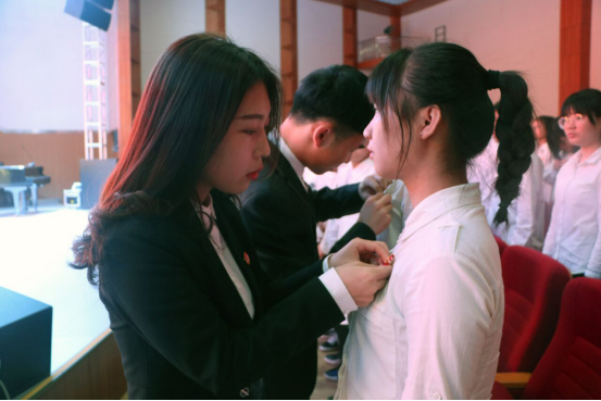 在庄严的国歌声中,入团宣誓仪式正式开始。校团委副书记董俊宣布新团员名单,新出炉的2017年度魅力团支书为新团员颁发团章、团员证和团徽,并为他们佩戴团徽。