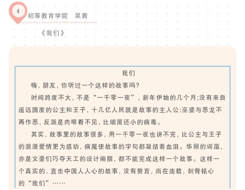 此次活动,全校师生积极关注,踊跃参与,全校5万余人次参与活动的网络投票。我校师生虽不能奋战抗疫前线,却依旧用自己的方式,讲述身边的抗“疫”故事,用文字传达温暖,用画笔凝聚力量,用真情鼓舞士气,用信念传递青年的担当,为英雄们加油,为战“疫”的胜利呐喊!初等教育学院吴茜表示:“写征文让我有了一个倾诉的方式,或许不能在一线或参与后勤工作为抗‘疫’做出自己的贡献,但我们能在字里行间表达最崇敬的敬意与感谢。”