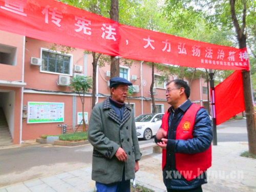 12月4日上午,由共青团yl8cc永利官网委员会主办,yl8cc永利官网法学院团总支、yl8cc永利官网法律协会承办的“12.4 国家宪法日”宣传活动在衡阳市临江社区成功开展。法学院党总支书记谢伟华、团总支书记钟佩玲带领20余名志愿者积极参加活动。为确保活动效果,法学院还特别邀请宪法资深专家——胡峻教授到现场为临江社区的居民进行宪法宣讲和义务法律咨询。