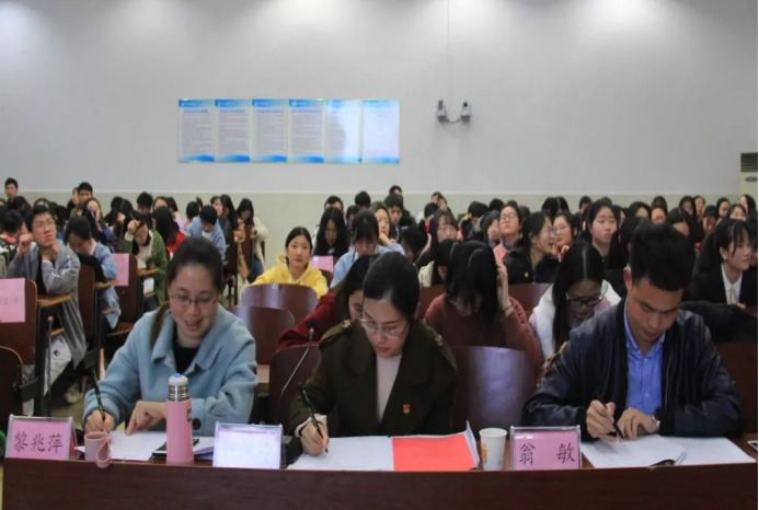 在2019年3月13日晚,法学院2018年度“五四红旗团支部”答辩大会在模拟法庭召开。法学院分团委书记钟佩玲,辅导员黎兆萍、翁敏出席会议并担任此次答辩大会评委。本次答辩大会有2017级、2018级共14个团支部参加。