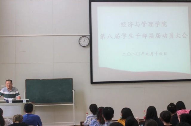9月16日下午1点,经济与管理学院于外语楼北110教室举行了经济与管理学院第八届学生干部换届动员大会,经济与管理学院党总支副书记黄懿、各年级辅导员老师、第七届分团委学生分会全体学生干部以及各班班长、团支书参加了此次会议,会议由分团委书记李湘龙老师主持。
