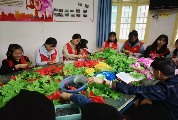 志愿者认真学习做绢花