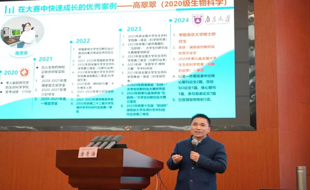 随后的分享环节干货满满。王中伟老师以国赛评审视角的“专业眼光”,拆解了优质项目的核心密码,抛出“专业深度,跨界广度”的项目打造黄金法则;他特别提醒学子警惕“形式化创新”,避免陷入“为创新而创新”的误区,为项目的精准定位与深度打磨指明了方向。唐青海教授则立足国赛实例,结合其多年指导“挑战杯”的丰富经验,着重探讨了项目从校园赛场走向社会应用的转化路径,他强调大一新生团队要过好备赛的“入门关”,他通过鲜活案例解析,提出“找平台-寻良师-真努力”是实现自我成长的“快车道”,点明了“跨专业协作是破解项目无法把握社会实际问题,无法突破创新点等现实难题的关键,提供了兼具专业高度与落地可行性的备赛思路。